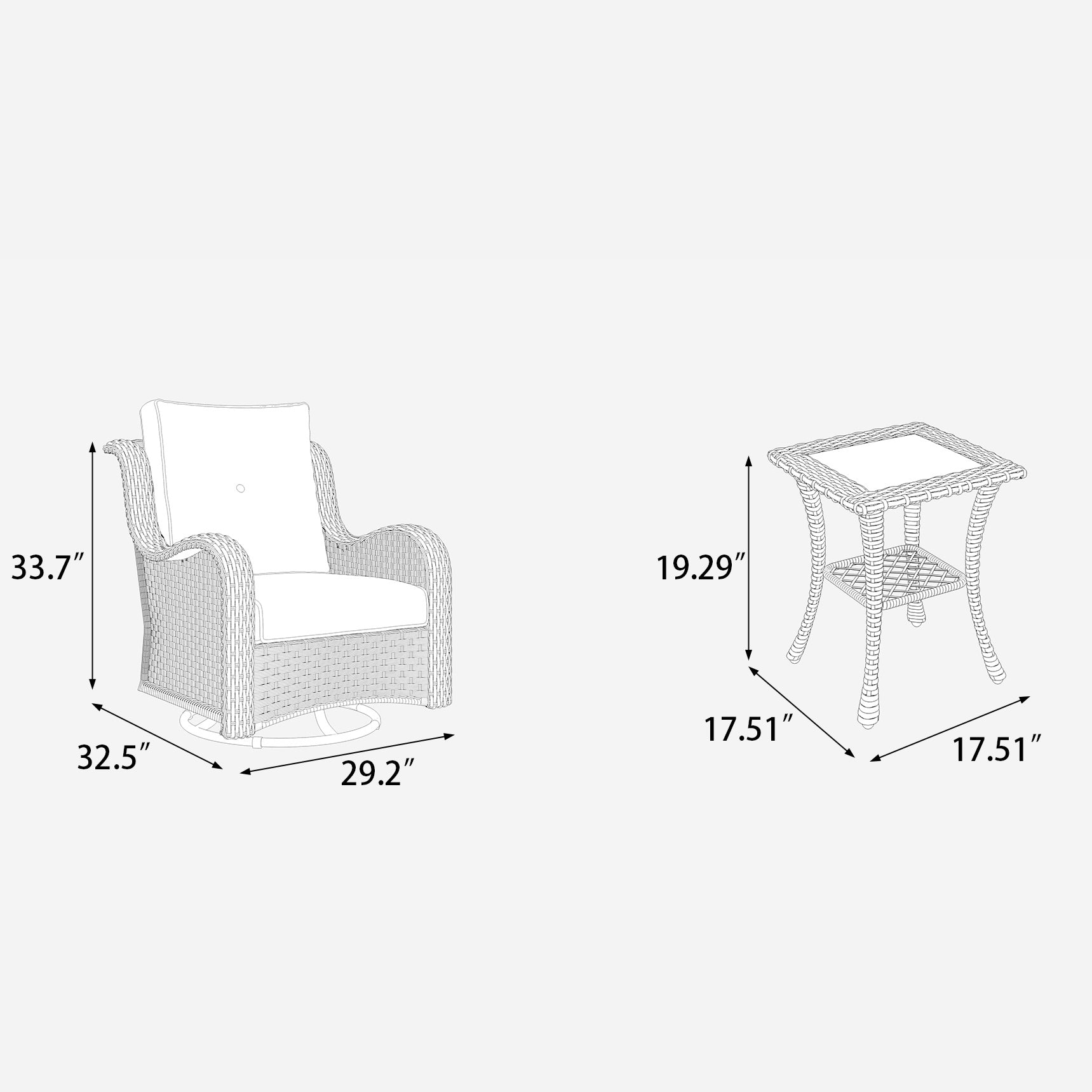 • The set consists of 2*swivel chairs and 1* coffee table.