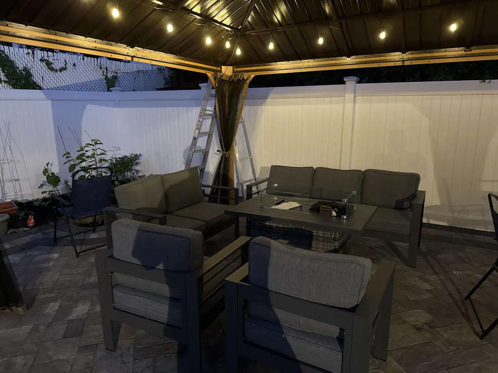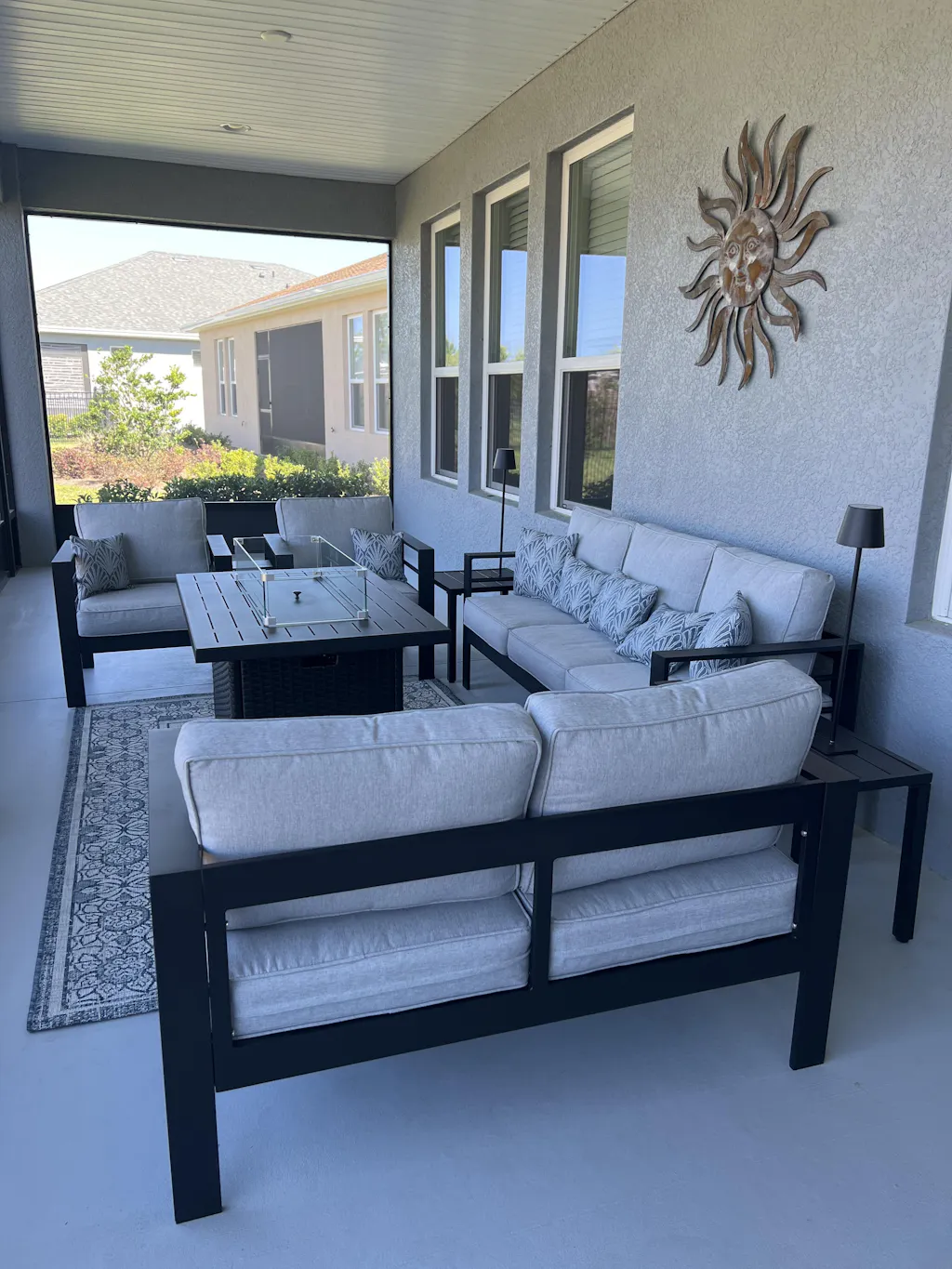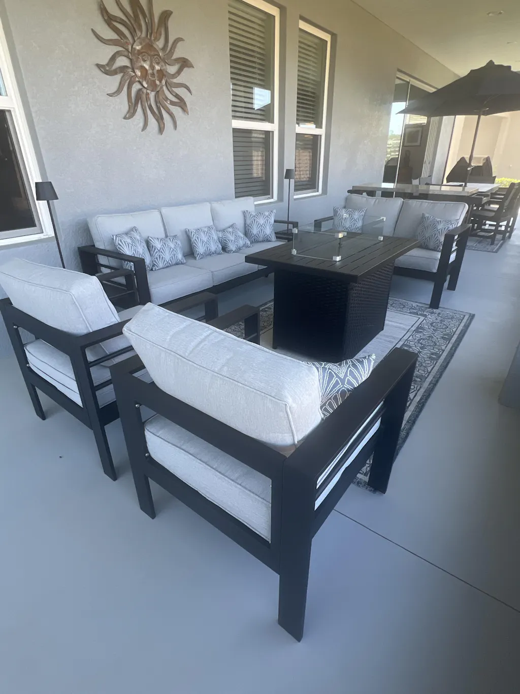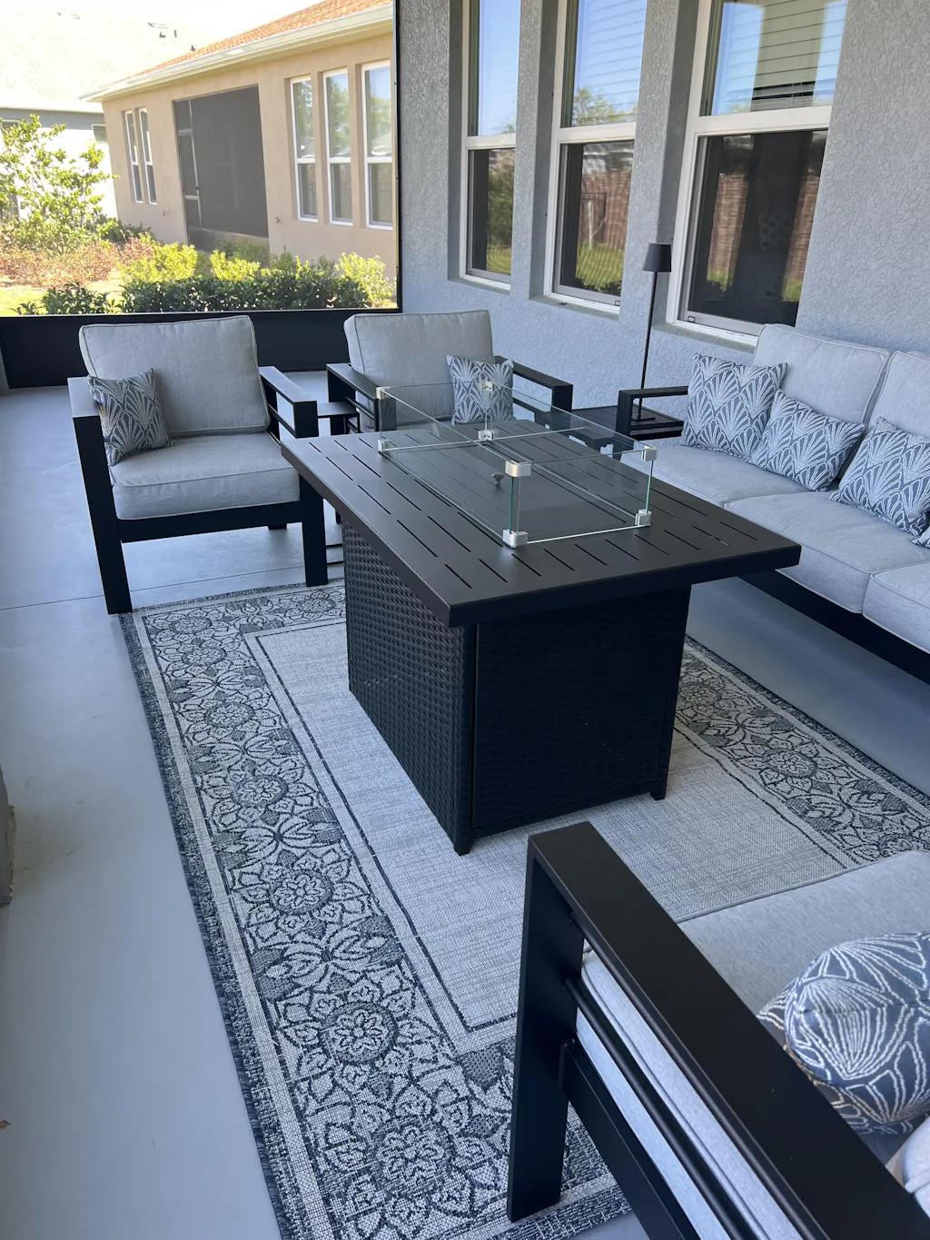 This set was perfect for my lanai. Fire pit table was easy to put together and works beautifully. Sofas and chairs went together easily. The cushions are thick.